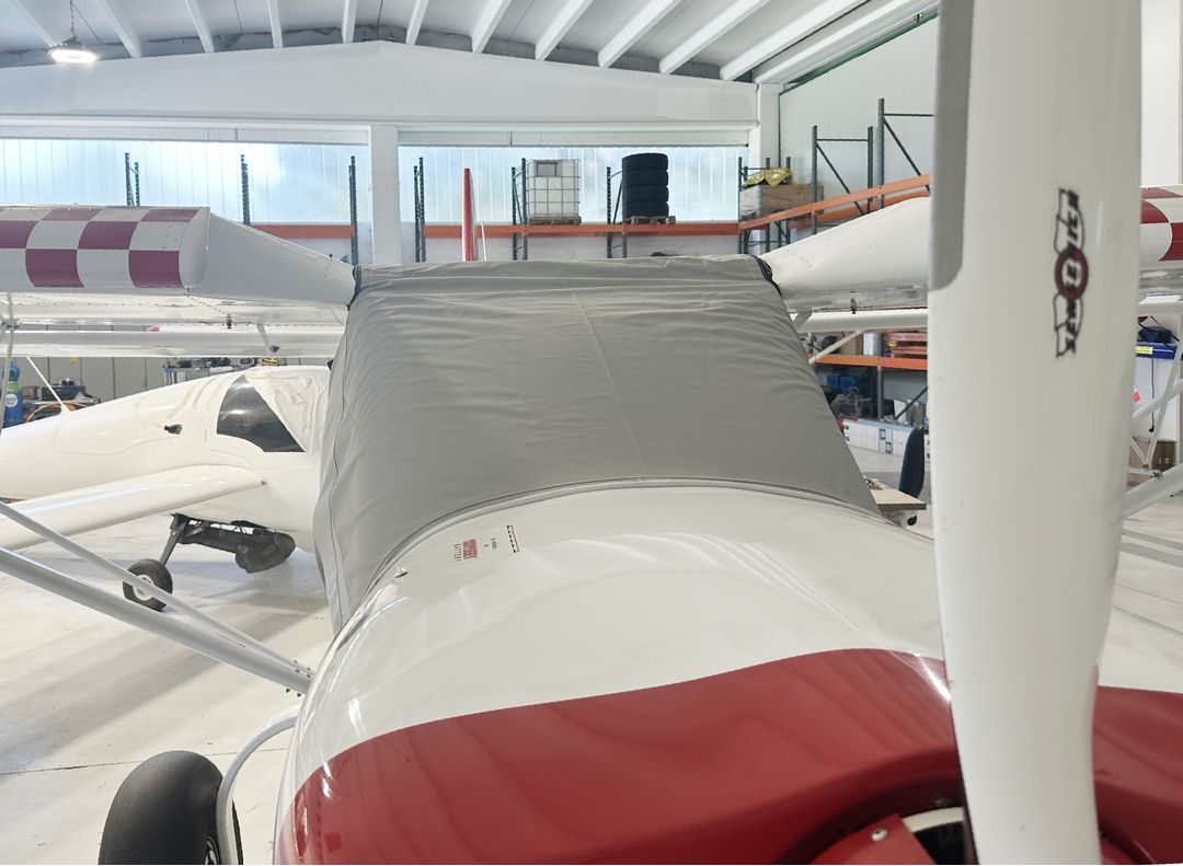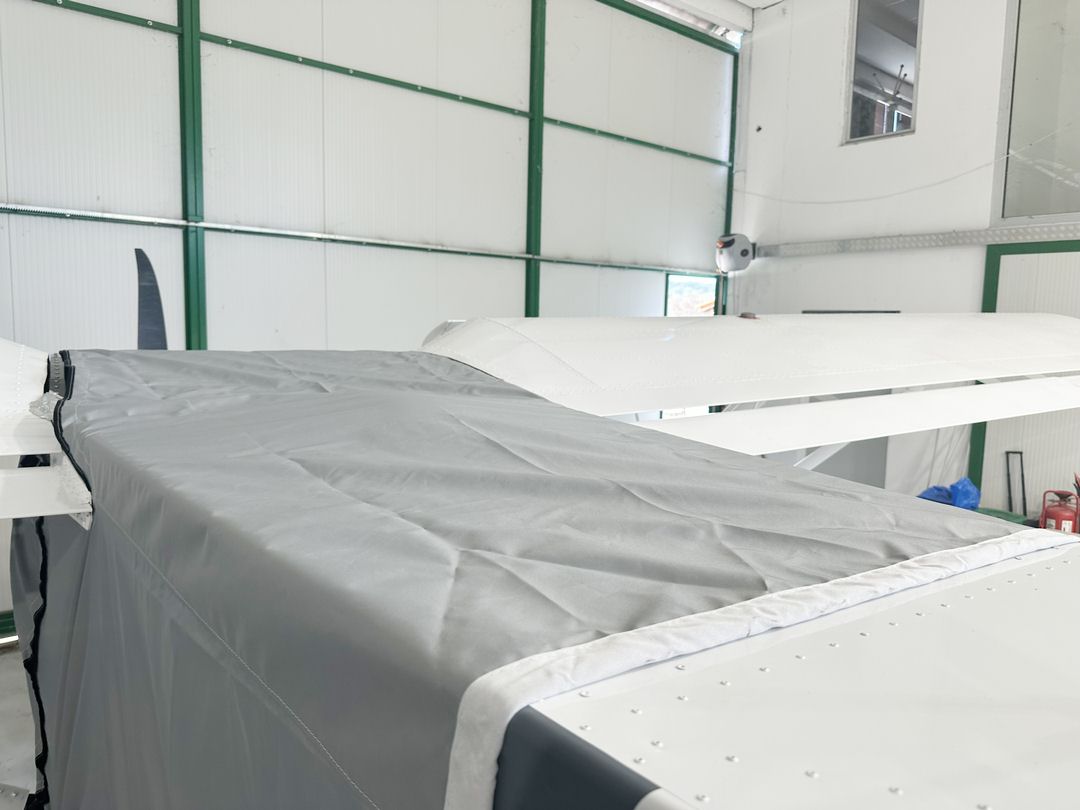 The Zenith Zenair 750, Cruzer, Super Duty Wing Covers are a perfect solution to protect your paint from sun damage and prevent winter frost, snow, ice buildup, and corrosion. They are made from Solution-Dyed Polyester or Acrylic Sunbrella and form-fit to slip around each wing tip, cover the entire upper surface of the wing and wrap around the leading and trailing edges. The covers secure under the wing with adjustable straps from the trailing edge to the leading edge. The wing covers can also attach to each other with adjustable straps at the leading and trailing edges of the wing under the belly of the plane. In some instances, cut-outs are made in the trailing edge of the wing covers to accommodate static wicks. We have the ability to also accommodate wing tip modifications, such as STOL kits, droop tips, and vortex generators. Wing covers are labeled LEFT and RIGHT for your convenience. Wing Covers are available for winter use or long-term, all-year use. A Hail Protection version can be made which incorporates very dense closed cell foam into the entire upper surface of the wing covers to help prevent hail damage. Although these covers are bulky, they do help protect your wing and control surfaces against small to medium-size hail.... leer más